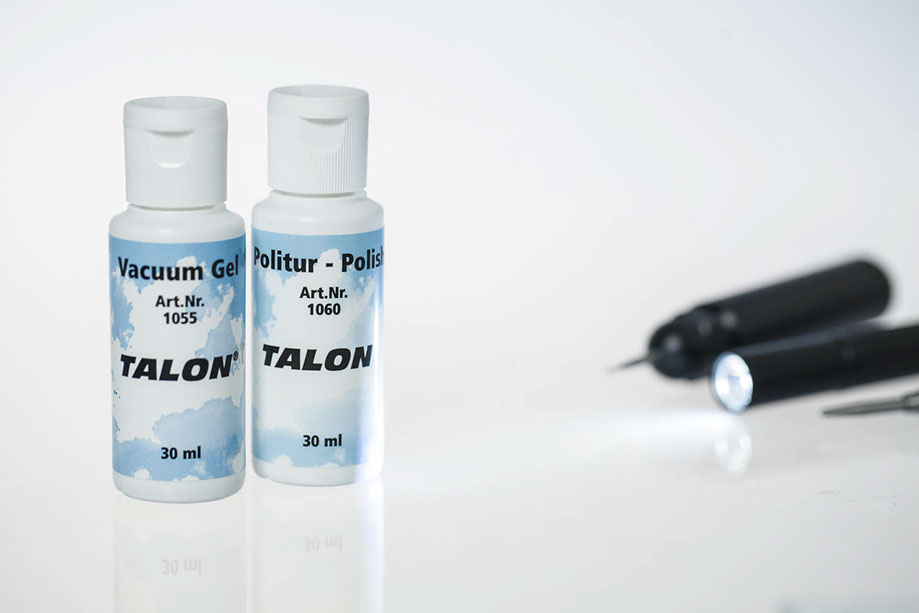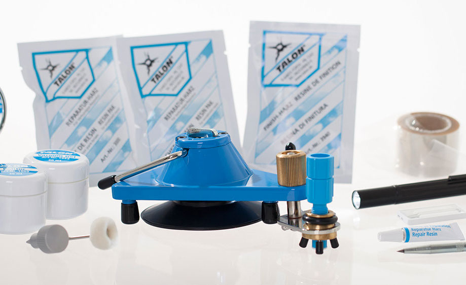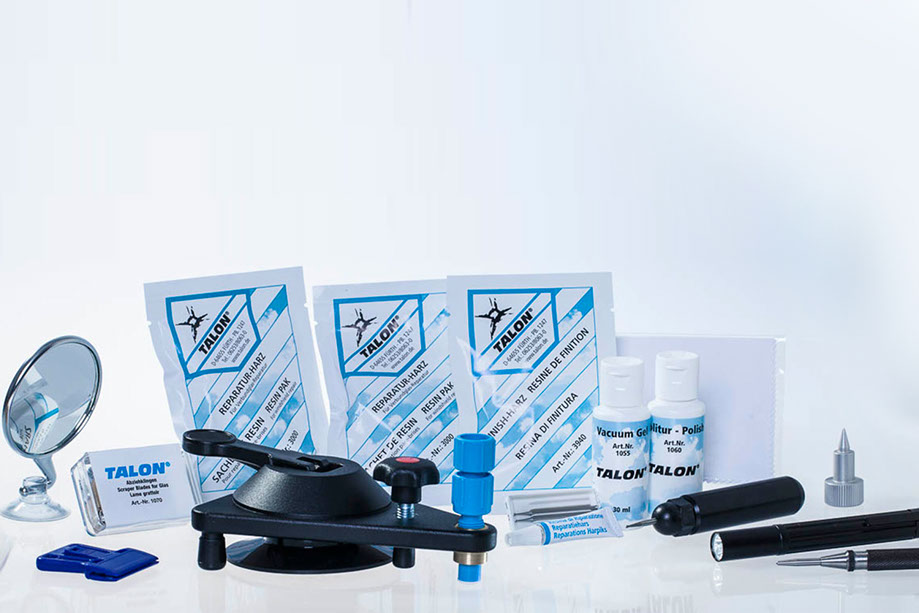 Die komplette Ausstattung des TALON-Reparatur-Sets beinhaltet alle Werkzeuge und Materialien für eine professionelle Steinschlagreparatur. Die Reparatursets werden auf Wunsch nach Ihren Vorstellungen angepasst.